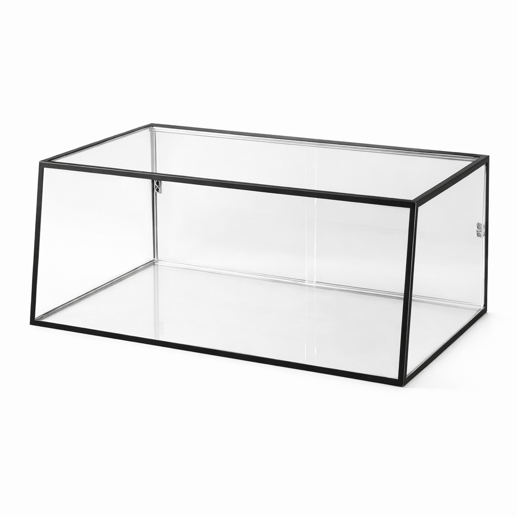 הויטרינה משלבת מסגרת מתכת שחורה בעיצוב מודרני עם מיכל פרספקס שקוף.